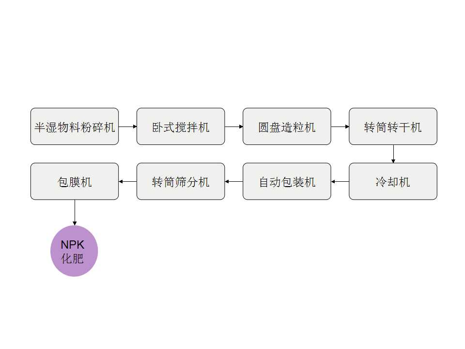 復合肥的生產工藝主要是以單體的基礎肥料(尿素、硝銨、氯化銨等)為原料,經粉碎至一定細度后,物料在造粒機的滾動床內通過增濕、加熱進行團聚造粒,在成粒過程中,有條件的還可以在造粒機加入少量的磷酸和氨,以改善成粒條件。造粒物料經干燥、篩分、冷卻即得到NPK復合肥料產品。